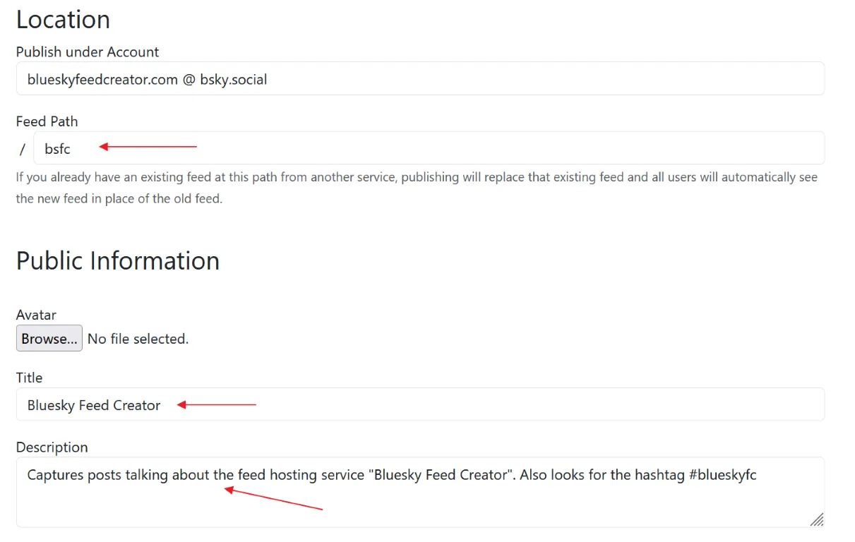 Section titled “Feed Path”This forms part of the public URL (website address) of your feed, combined with your Bluesky handle. A good idea is to keep it short so it’s easily memorable, e.g. “nzpets” - but it can be up to 15 characters long.