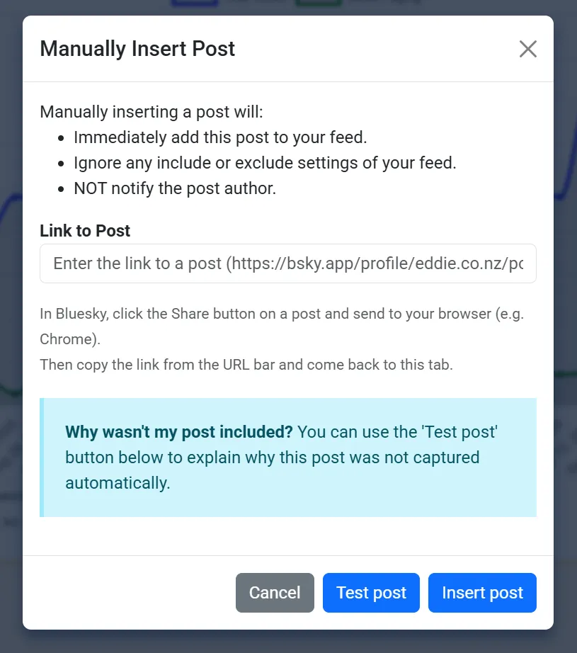 Click the ‘Insert post manually’ button, and you will see this dialog box. You can follow the instructions to get the post link in Bluesky. Copy the post link into the Link to Post box and click Insert Post - now the post will be visible in your feed.