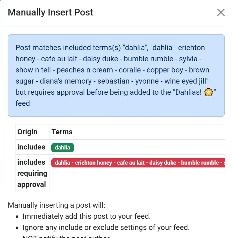 Section titled “Testing a post”If you think a post should have appeared in your feed, but was not captured, you can also use the Manually Insert Post dialog to test the post before you insert it. You will be shown a reason why the post does or does not match your feed: