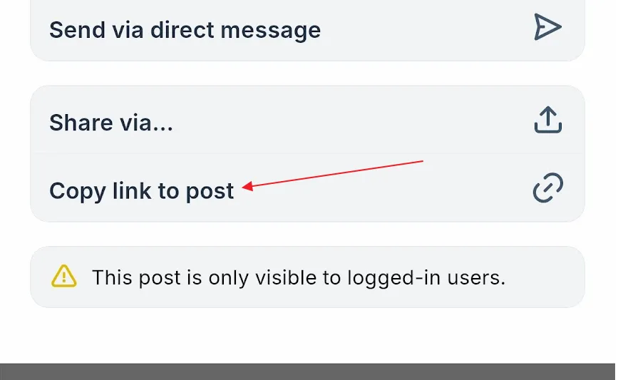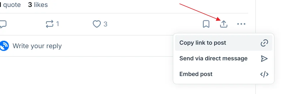 Section titled “Getting a link to a post”Click on the share menu, on the bottom right of a post. In this menu, click Copy link to post.