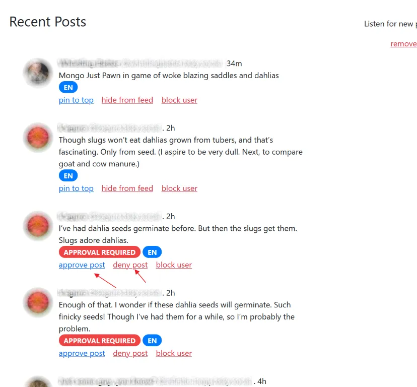 Posts which require approval will show up in the settings page for your feed, alongside all the automatically included posts. You can choose to approve or deny them.