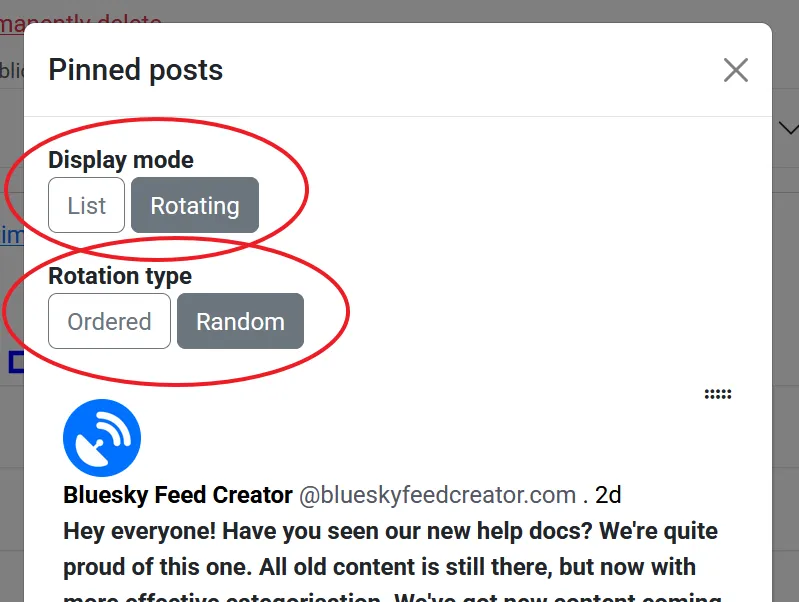 Once you add more than one pinned post, you get some options - you can decide whether to have your pinned posts appear in a list (all users see all of the pinned posts at the top of the feed whenever they load it) or on a rotating basis (one pinned post at a time at the top of the feed) - and you can decide whether the rotation should be in order, or random.