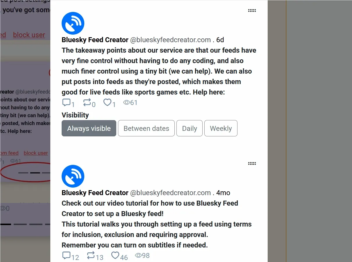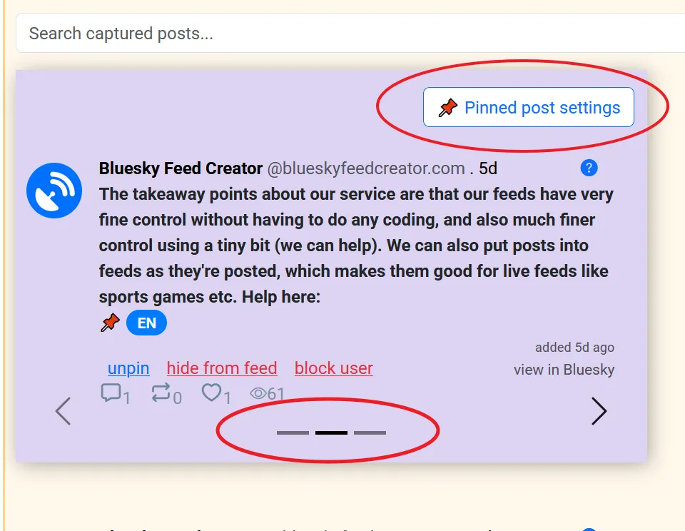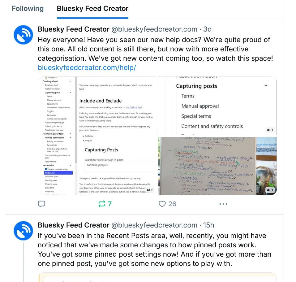 You can pin posts to your feed so that they are always there when a Bluesky user views your feed. These might include information about the feed e.g. hashtags to use for inclusion, or they might be for other feed announcements like events and so on.