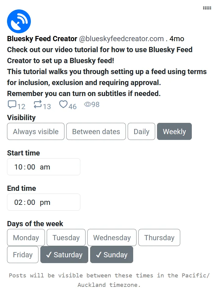 You can schedule a pinned post to only be pinned to the feed at a particular time. You can choose different schedules, between daily and weekly or two given dates - and we’ll have you select a start and end time too.