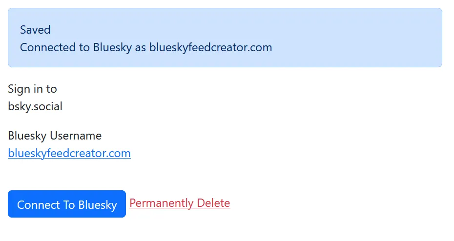 Section titled “Adding a new Account”To add a new account, you will need to fill in your Bluesky username (e.g. fyodork.bsky.nz), and then press “Connect To Bluesky”. This will redirect you Bluesky’s own login page, where you will need to enter your Bluesky password and then authorise the connection.