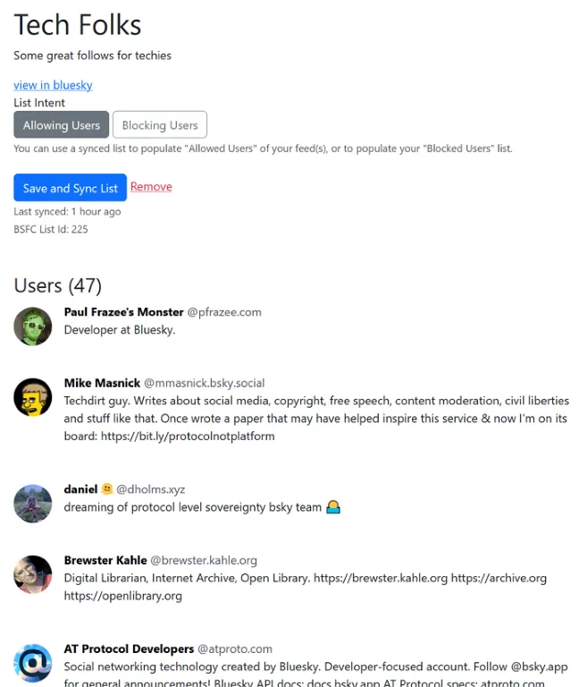 Here, we can see the Tech Folks starter pack inside the ‘My synced lists’ area. The starter pack is now a synced list which can be used to allow, or block users from posting in a feed.