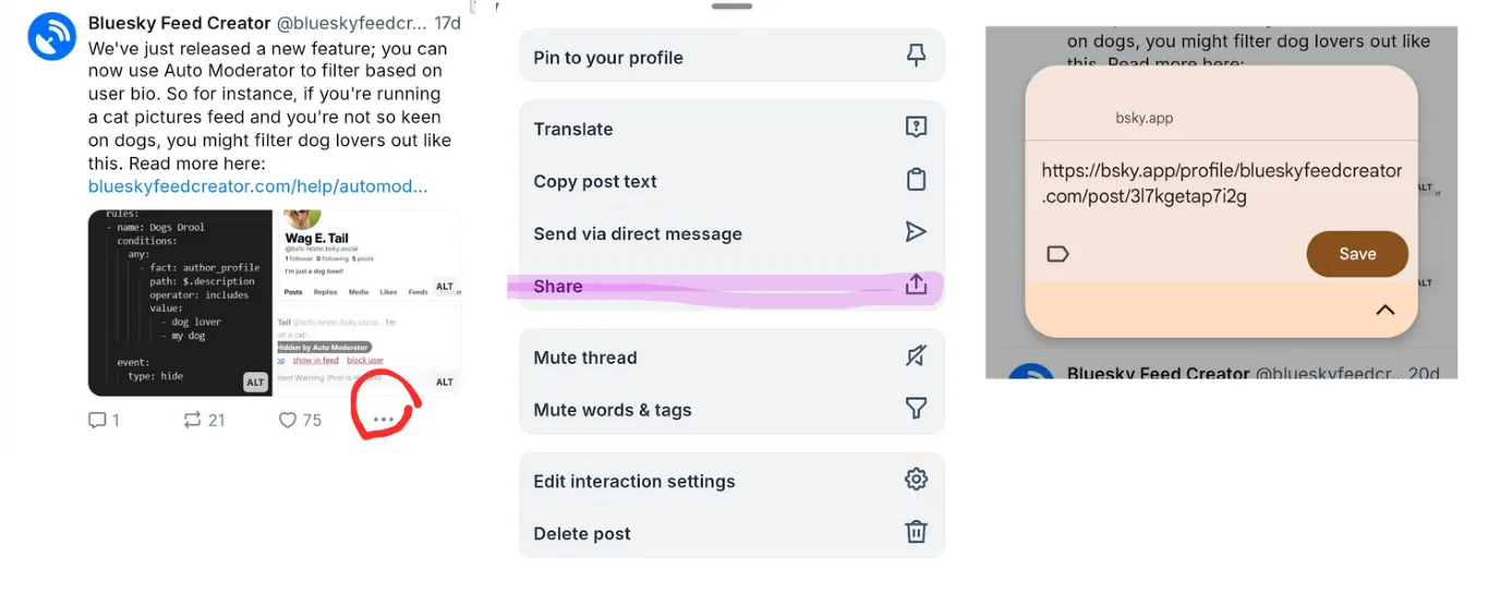 Section titled “Bluesky on a phone app”Click on the three dots menu, on the bottom right of a post.
