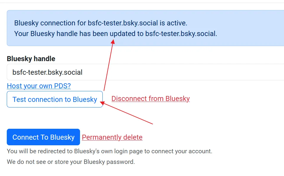 You can refresh your connected account’s username by pressing the “Test connection to Bluesky button” in your connected account detail. This will check if your handle has changed and automatically update if needed:
