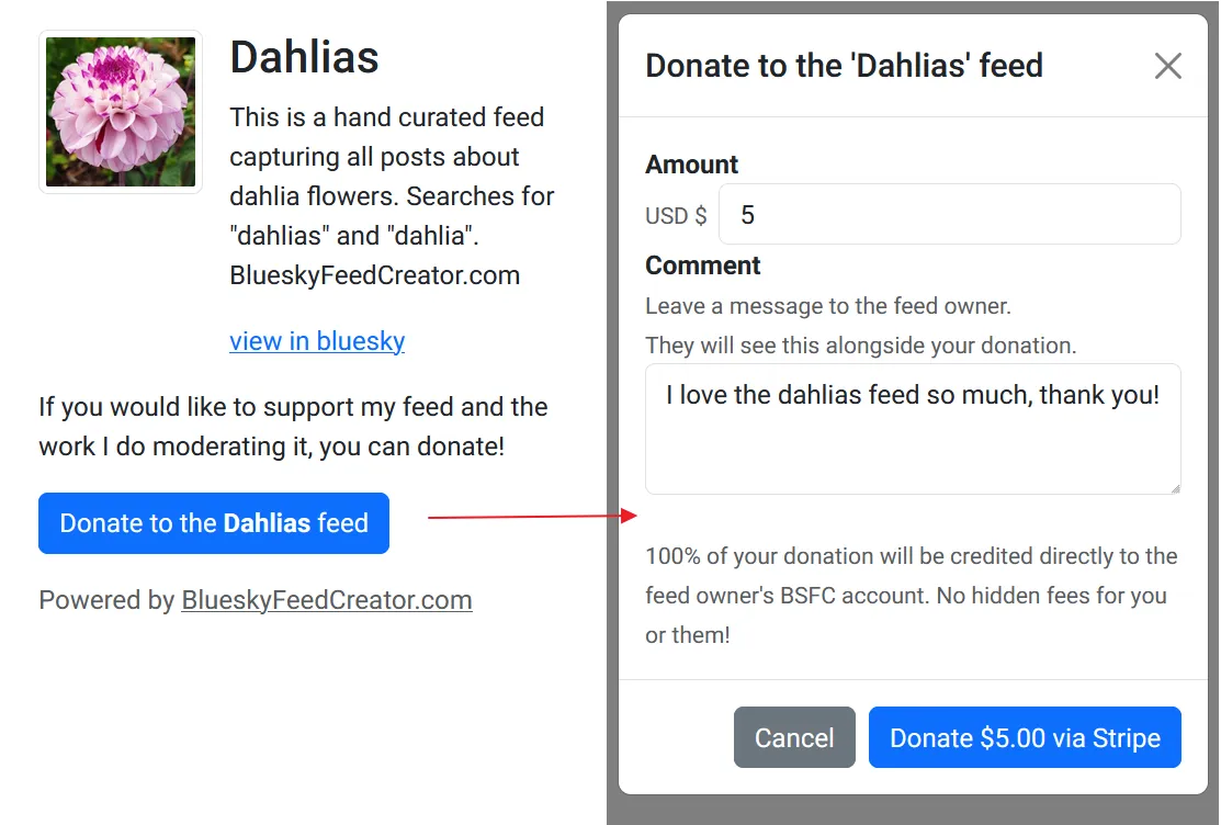 Section titled “Collecting donations”Every public description page has the option to collect donations on your behalf. Add the shortcode [donate] anywhere in your public page to show a donate button to your users. They can then choose any amount to donate, and optionally leave a message. Any donations received will be applied as credits to your Bluesky Feed Creator account, and will automatically be applied to your next subscription renewal.